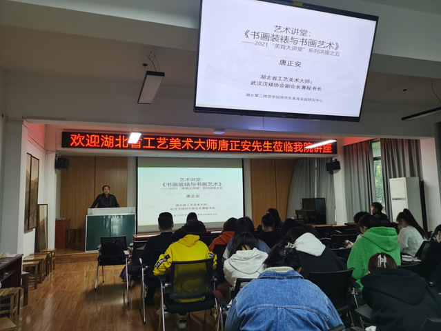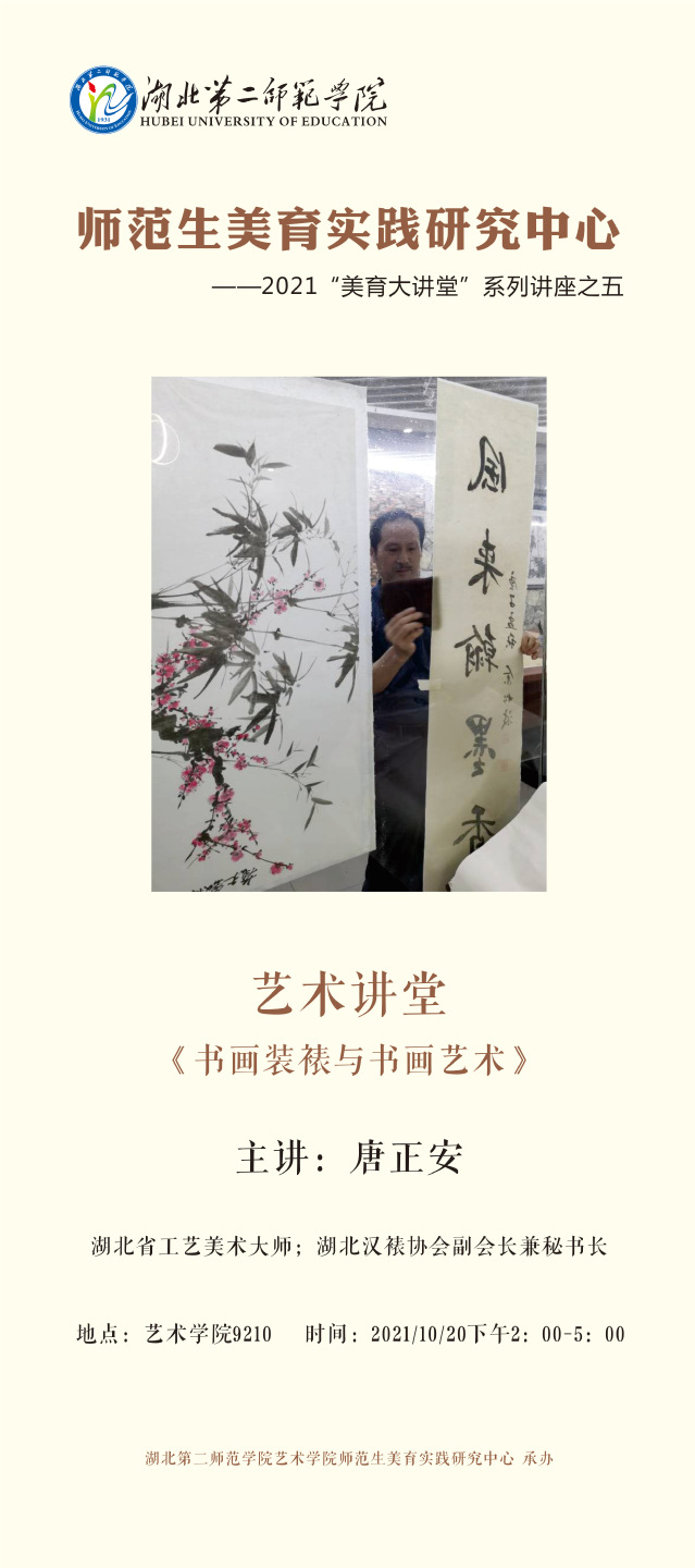 本网讯(通讯员唐克石)2021年10月20日14:00—17:00由湖北二师师范生美育实践研究中心承办的2021“美育大讲堂”系列讲座之五《书画装裱与书画艺术》在艺术楼9210举行。本次讲座邀请湖北省工艺美术大师、武汉汉裱协会副会长兼秘书长唐正安大师担任主讲嘉宾,讲座面向艺术学院和全校学生开放。